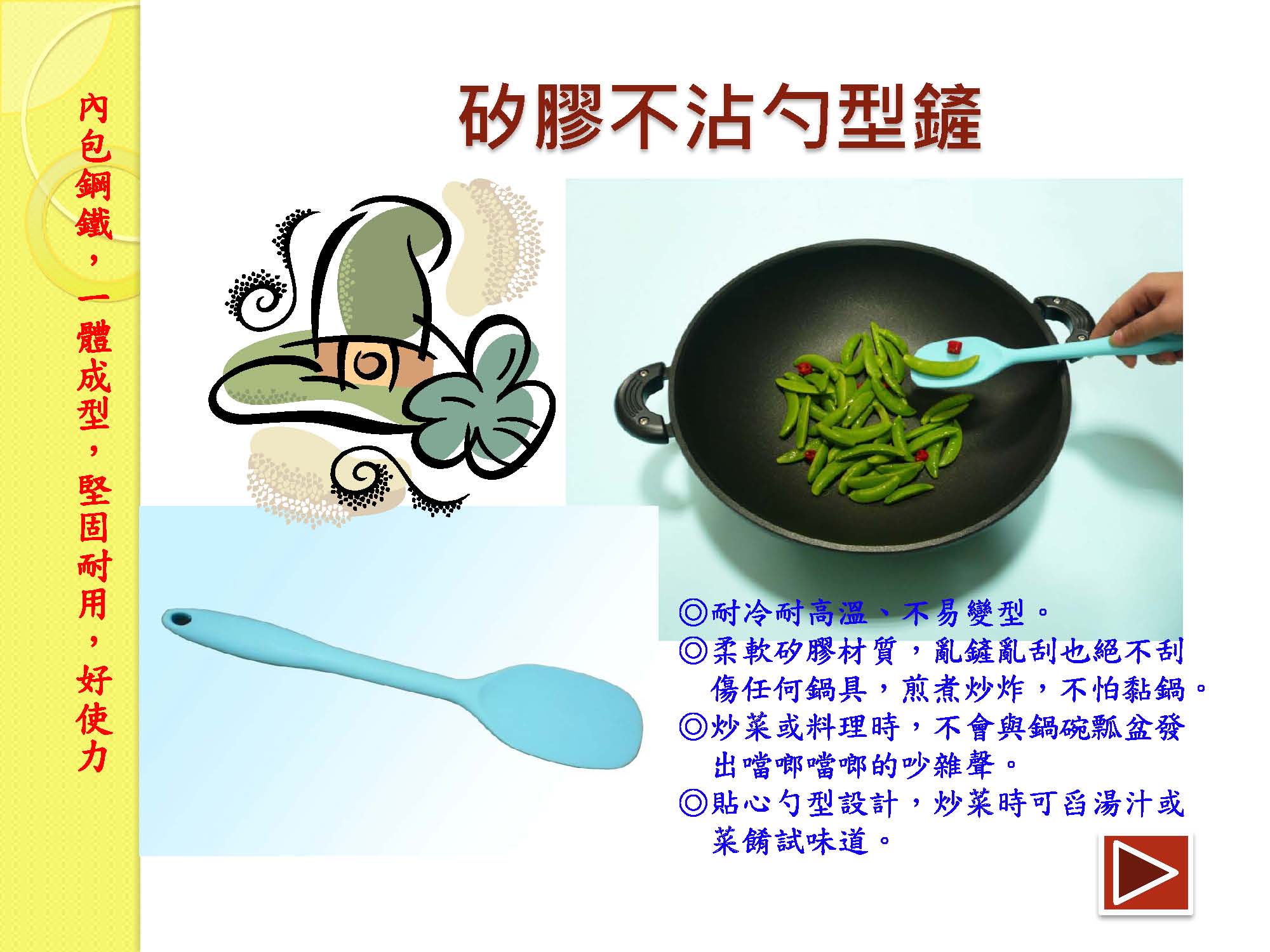 ○炒菜或料理時,不會與鍋碗瓢盆發出噹啷噹啷的吵雜聲。
